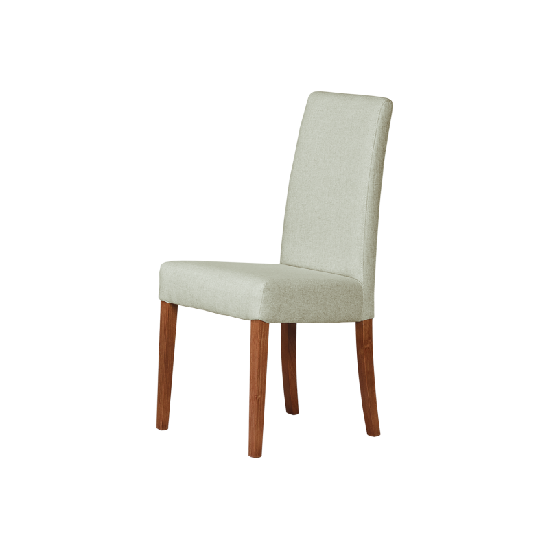 Cadeira para sala de jantar, com assento e costas estofadas. Elegante, robusta e confortável, apresenta várias opções de tecido e acabamentos em madeira para as pernas.