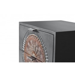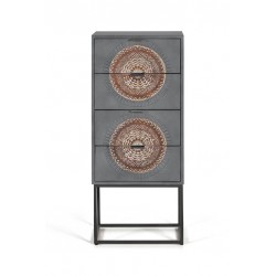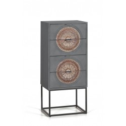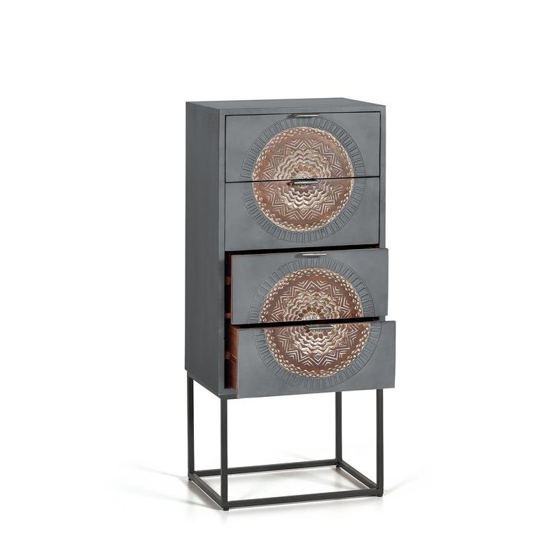 Camiseiro com 4 gavetas em madeira de manga e base de metal, detalhes frontais talhados à mão.